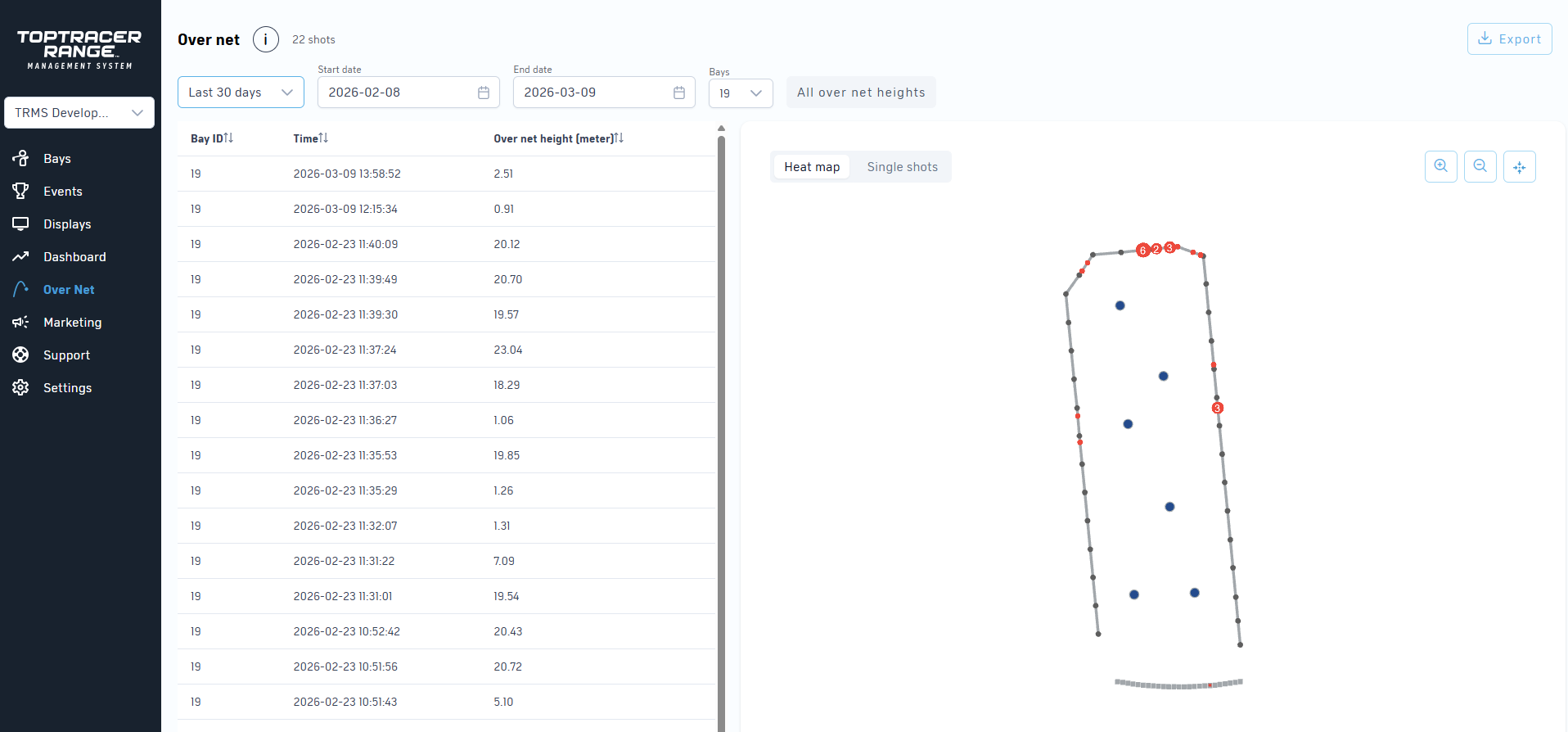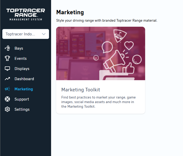 Marketing has been moved out to the main navigation and gotten it's own page. We are hoping this will make it easier to find and enable you to style your driving range with branded Toptracer Range material!