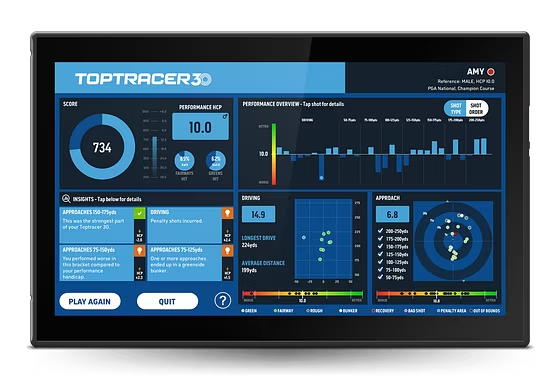 At the end of the round, players receive a performance handicap and game score, along with insights that highlight strengths and the top three areas to focus on for improvement. This makes T30 a valuable tool for tracking progress and targeting practice more effectively.