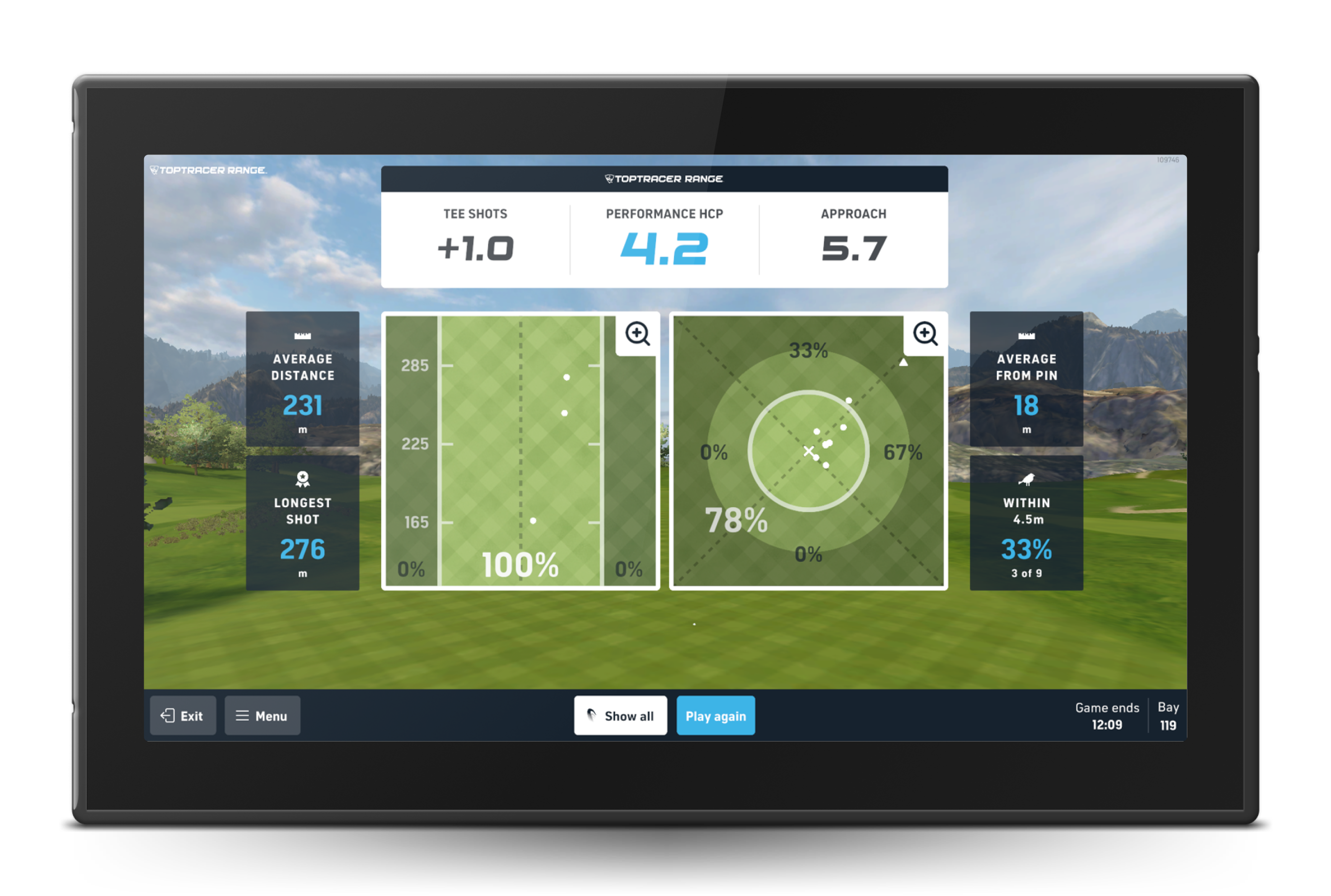 After completing the game, you’ll receive a Performance Handicap, shot dispersion maps, and key stats. Results are based on your chosen reference handicap and use the Strokes Gained method to compare your shots against an average player of similar ability. Separate performance handicaps are given for driving and approach play.